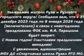 Сообщаем вам, что ФОК им. А. А. Парашина будет закрыт с 31 декабря 2023 года по 8 января 2024 года в связи с праздничными выходными! С уважением, администрация МБУ ДО «Спортивная школа Руза» РГО МО.